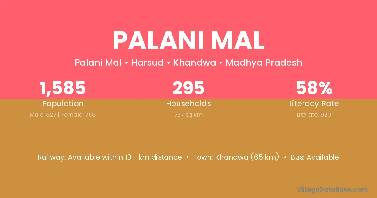 Khandwa (65 km) is the nearest town to Palani Mal village for major economic activities and is located approximately 65 km away.