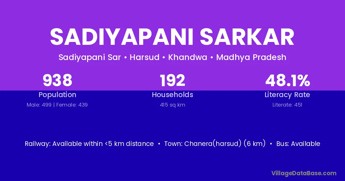 Chanera(harsud) (6 km) is the nearest town to Sadiyapani Sarkar village for major economic activities and is located approximately 6 km away.