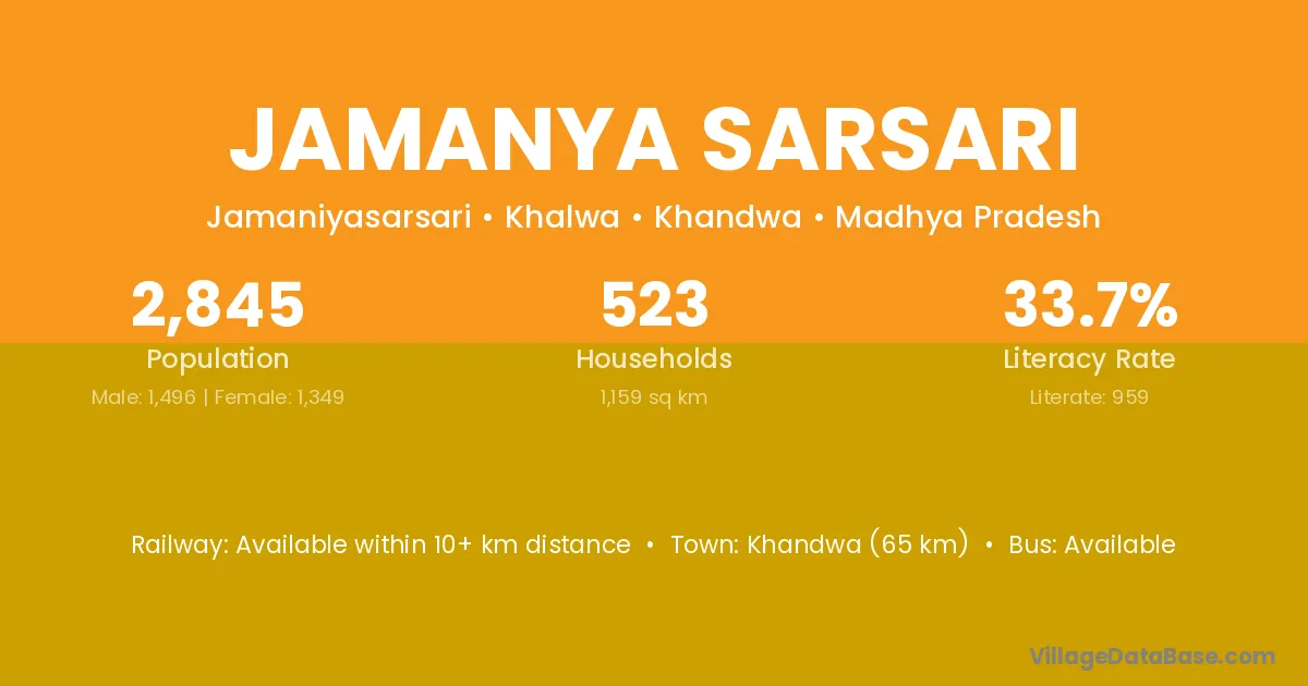 Khandwa (65 km) is the nearest town to Jamanya Sarsari village for major economic activities and is located approximately 65 km away.
