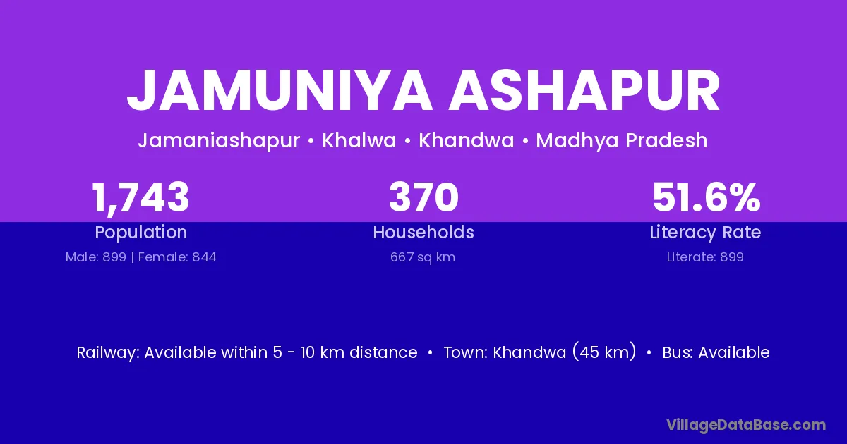 Khandwa (45 km) is the nearest town to Jamuniya Ashapur village for major economic activities and is located approximately 45 km away.