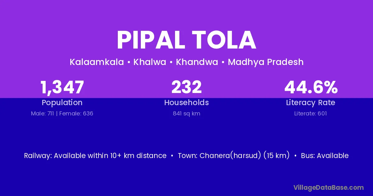 Chanera(harsud) (15 km) is the nearest town to Pipal Tola village for major economic activities and is located approximately 15 km away.
