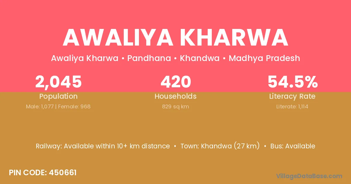 Khandwa (27 km) is the nearest town to Awaliya Kharwa village for major economic activities and is located approximately 27 km away.