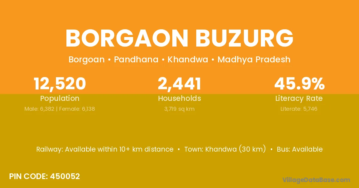 Khandwa (30 km) is the nearest town to Borgaon Buzurg village for major economic activities and is located approximately 30 km away.