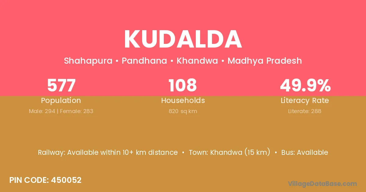 Khandwa (15 km) is the nearest town to Kudalda village for major economic activities and is located approximately 15 km away.