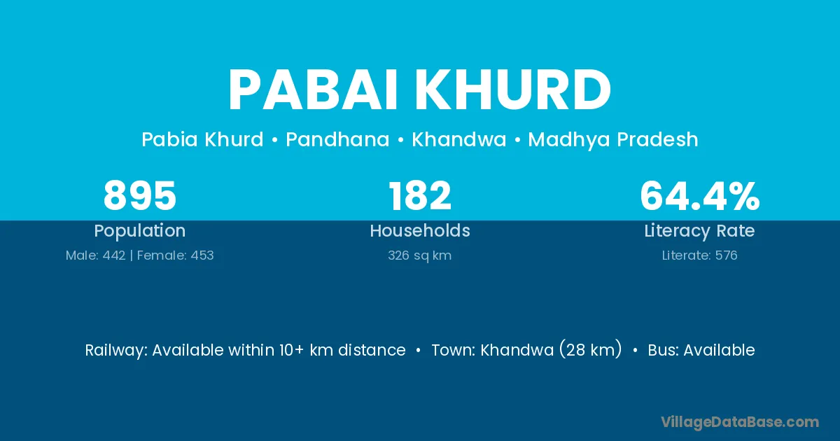 Khandwa (28 km) is the nearest town to Pabai Khurd village for major economic activities and is located approximately 28 km away.
