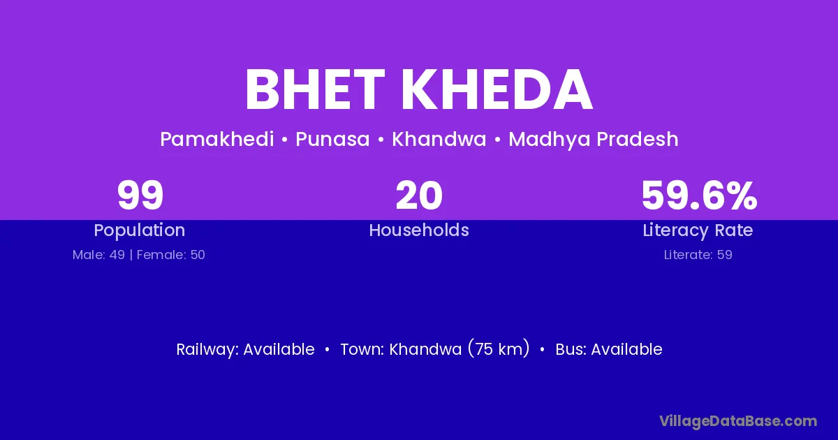 Khandwa (75 km) is the nearest town to Bhet Kheda village for major economic activities and is located approximately 75 km away.