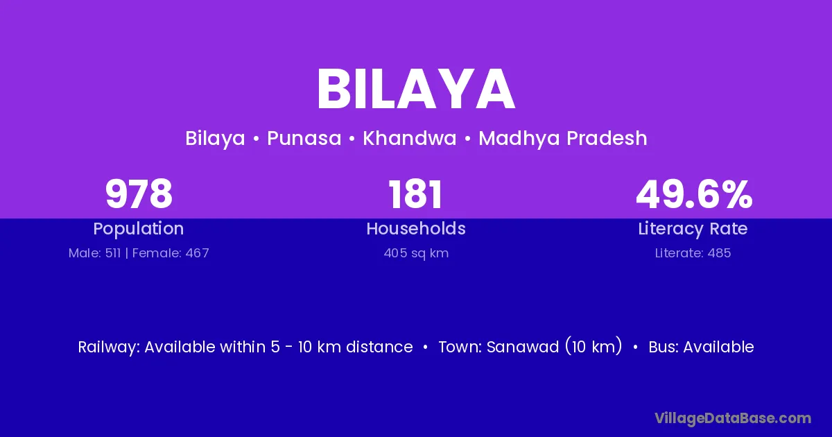 Sanawad (10 km) is the nearest town to Bilaya village for major economic activities and is located approximately 10 km away.