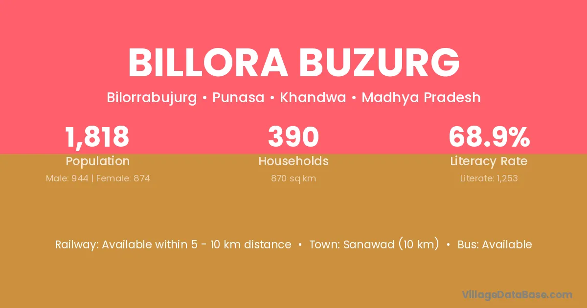 Sanawad (10 km) is the nearest town to Billora Buzurg village for major economic activities and is located approximately 10 km away.