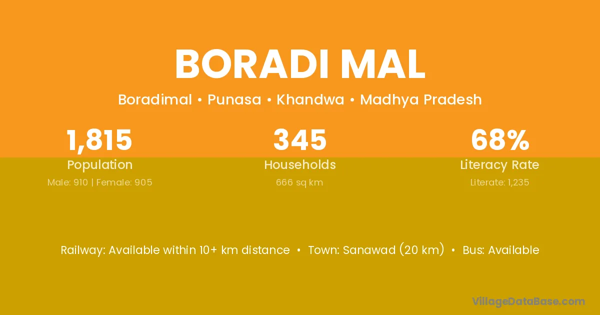 Sanawad (20 km) is the nearest town to Boradi Mal village for major economic activities and is located approximately 20 km away.