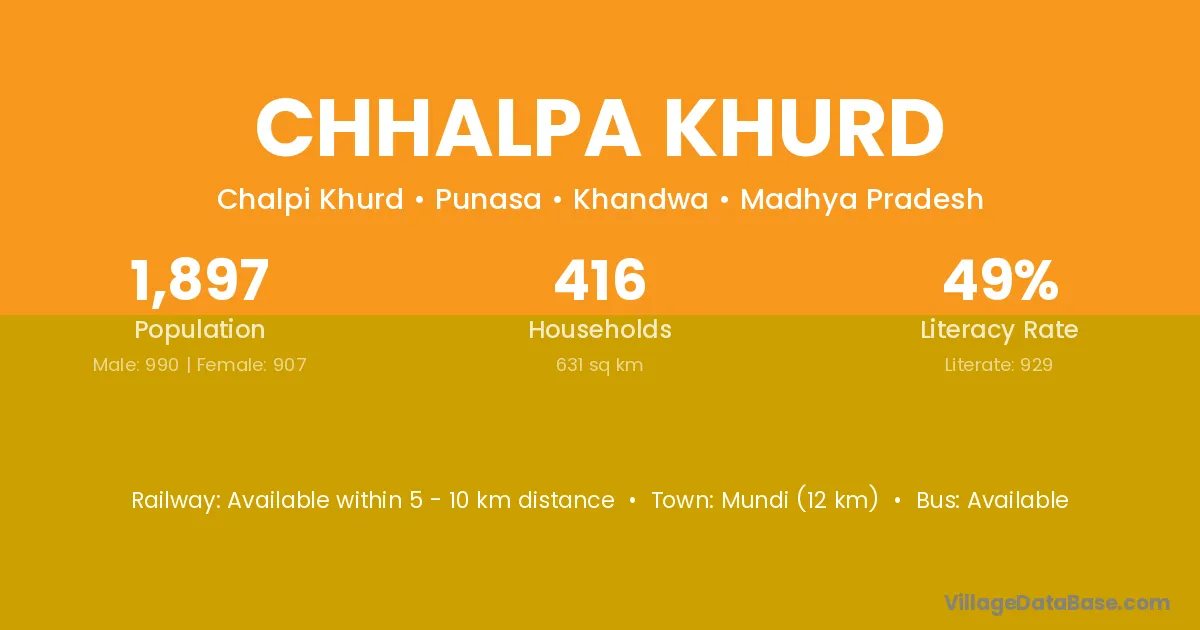 Mundi (12 km) is the nearest town to Chhalpa Khurd village for major economic activities and is located approximately 12 km away.