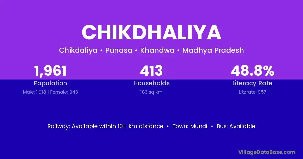 Chikdhaliya village has a total population of 1,961 people, of which 1,018 are males and 943 are females.