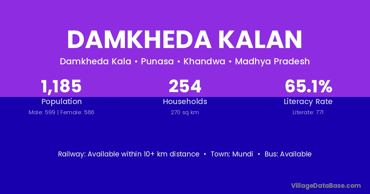 Damkheda Kalan village has a total population of 1,185 people, of which 599 are males and 586 are females.