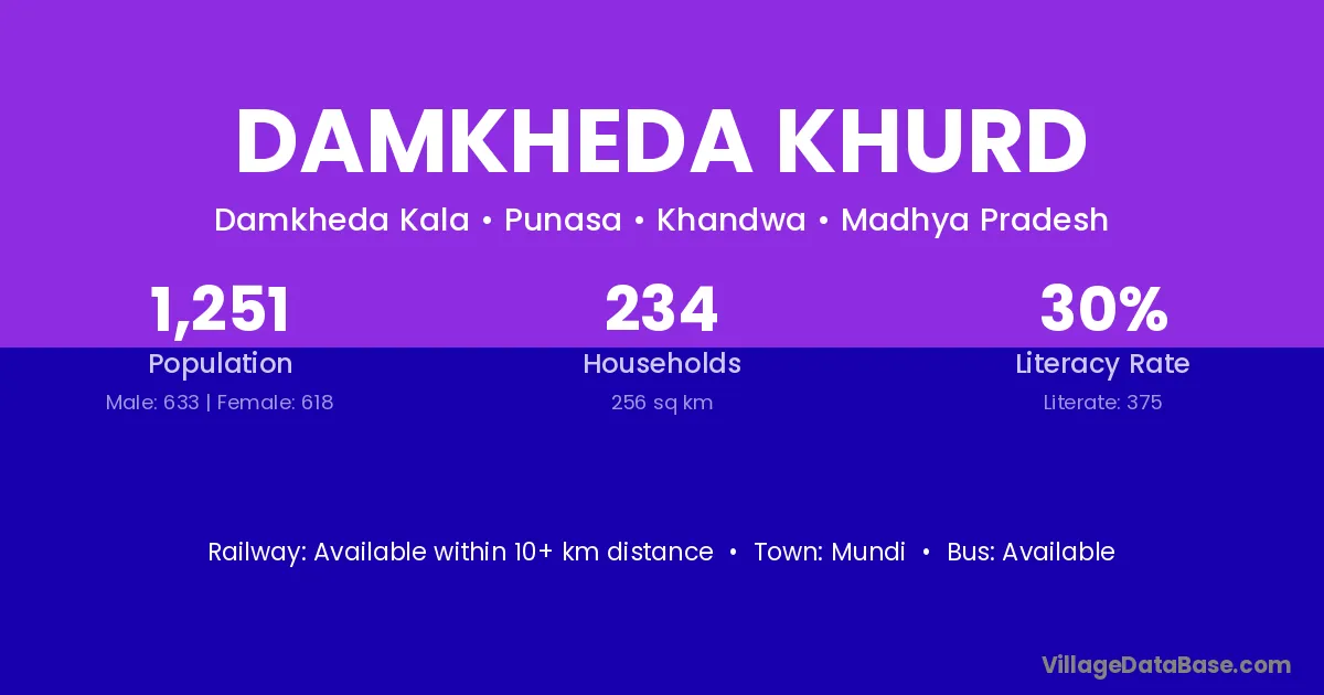 Damkheda Khurd village has a total population of 1,251 people, of which 633 are males and 618 are females.