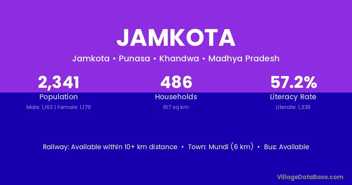 Mundi (6 km) is the nearest town to Jamkota village for major economic activities and is located approximately 6 km away.
