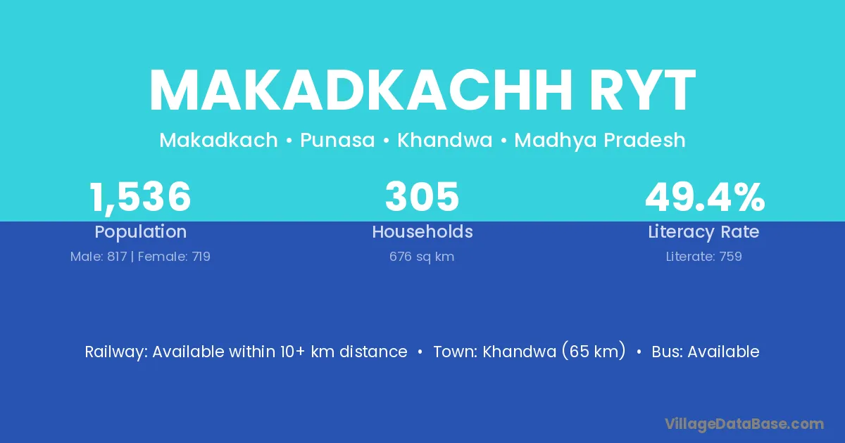 Khandwa (65 km) is the nearest town to Makadkachh Ryt village for major economic activities and is located approximately 65 km away.