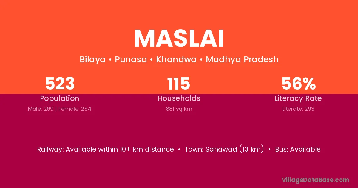 Sanawad (13 km) is the nearest town to Maslai village for major economic activities and is located approximately 13 km away.