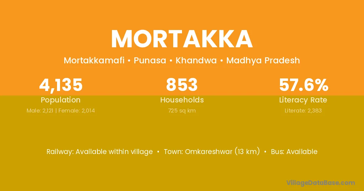 Omkareshwar (13 km) is the nearest town to Mortakka village for major economic activities and is located approximately 13 km away.