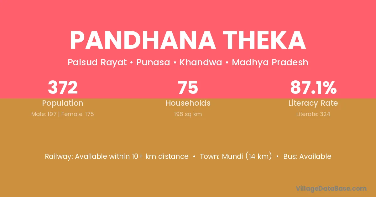 Mundi (14 km) is the nearest town to Pandhana Theka village for major economic activities and is located approximately 14 km away.