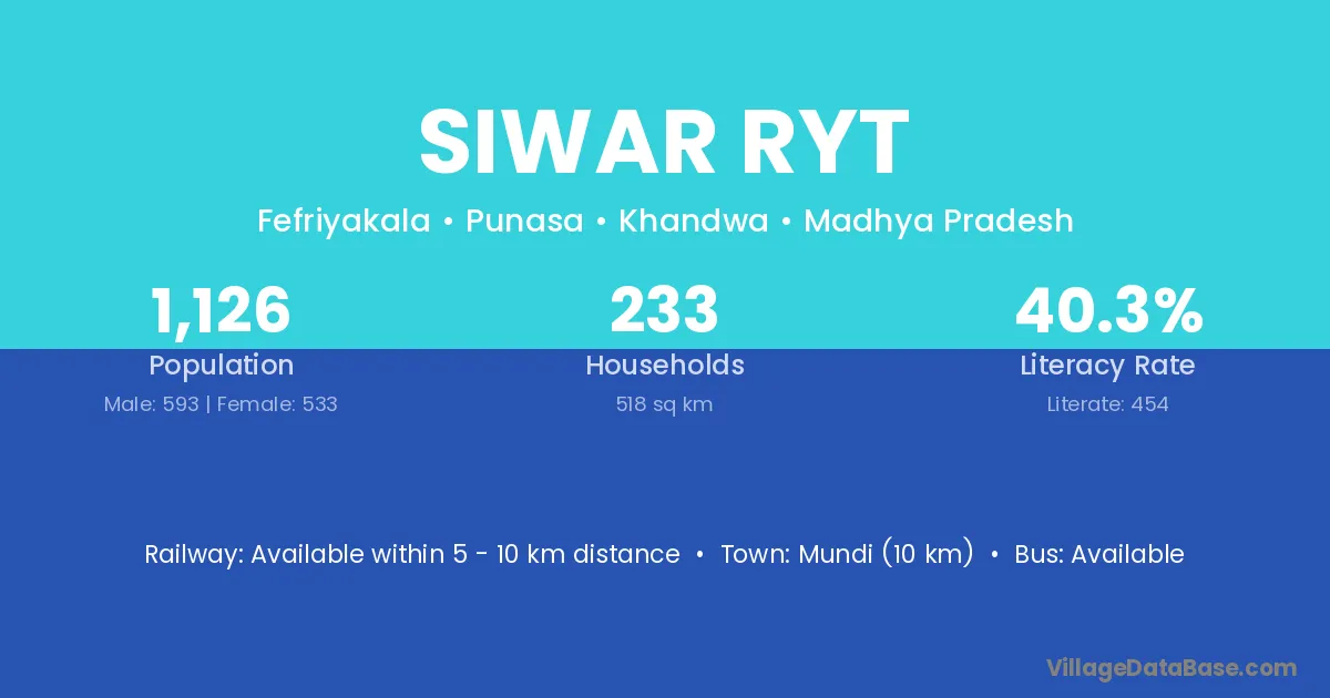 Siwar Ryt village has a total population of 1,126 people, of which 593 are males and 533 are females.