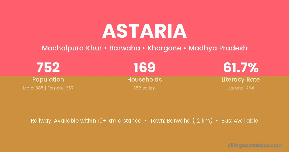 Barwaha (12 km) is the nearest town to Astaria village for major economic activities and is located approximately 12 km away.