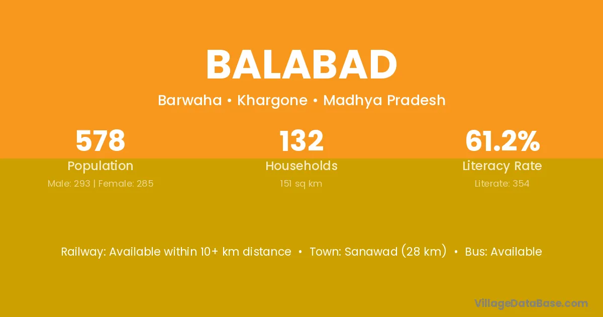 Sanawad (28 km) is the nearest town to Balabad village for major economic activities and is located approximately 28 km away.
