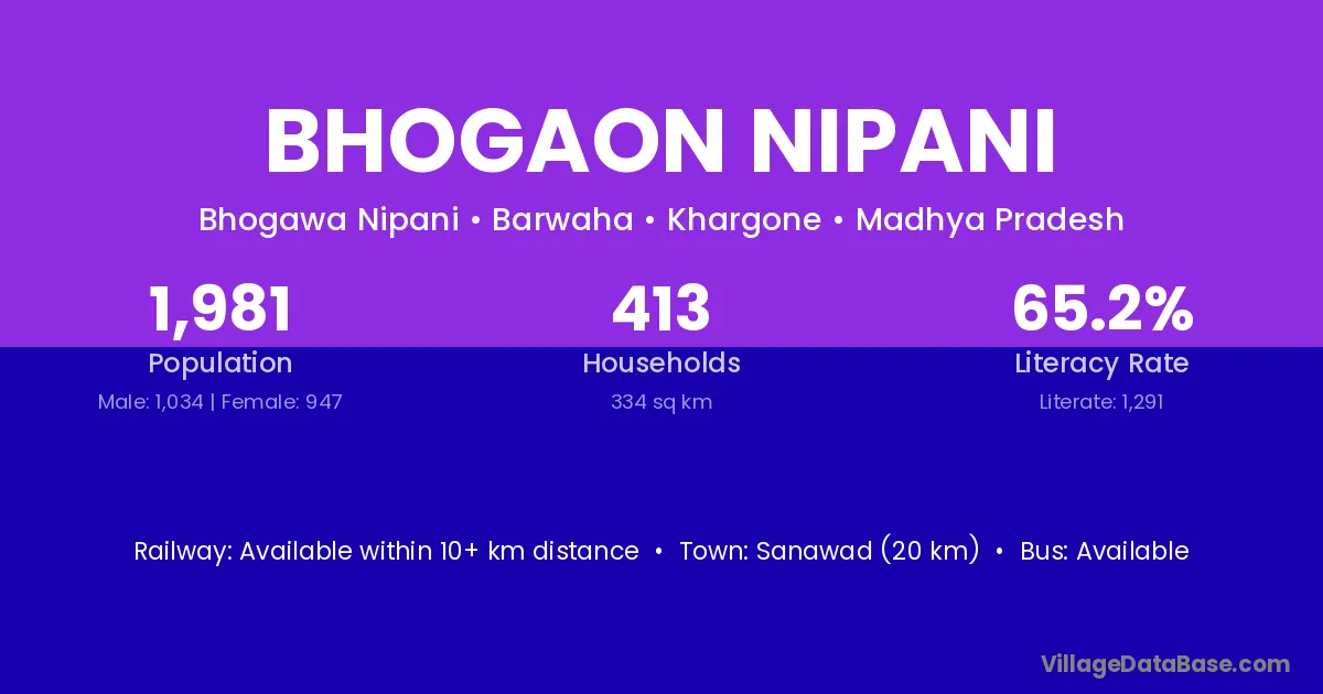 Sanawad (20 km) is the nearest town to Bhogaon Nipani village for major economic activities and is located approximately 20 km away.