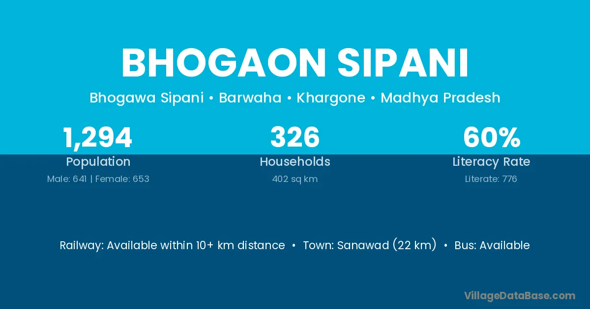 Sanawad (22 km) is the nearest town to Bhogaon Sipani village for major economic activities and is located approximately 22 km away.