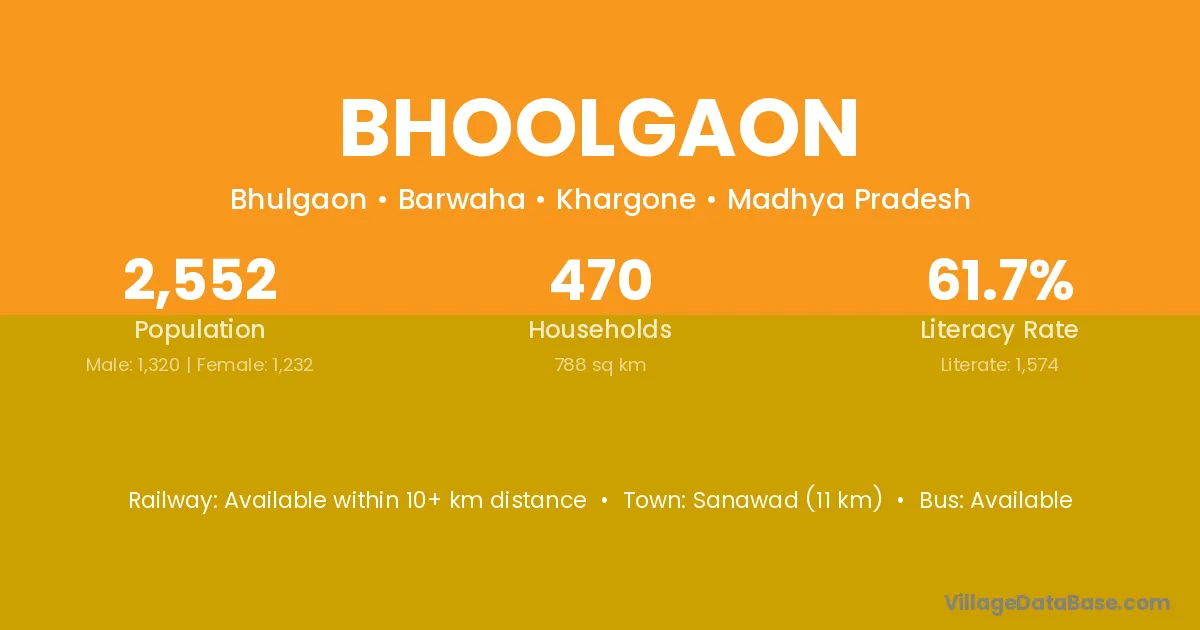 Sanawad (11 km) is the nearest town to Bhoolgaon village for major economic activities and is located approximately 11 km away.