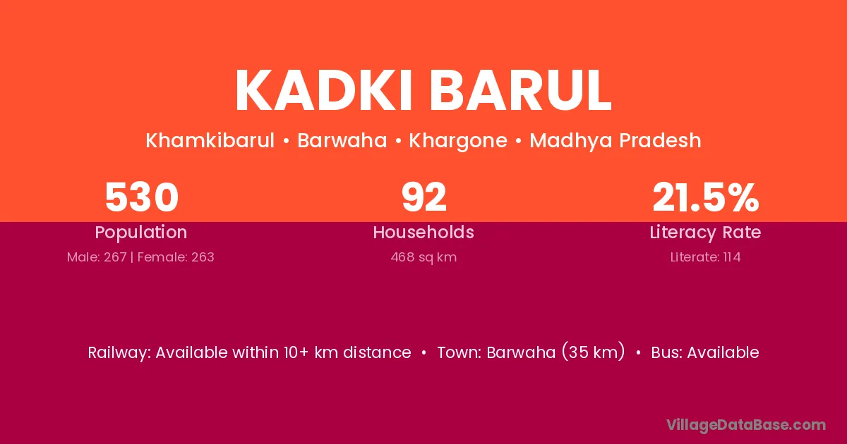 Barwaha (35 km) is the nearest town to Kadki Barul village for major economic activities and is located approximately 35 km away.