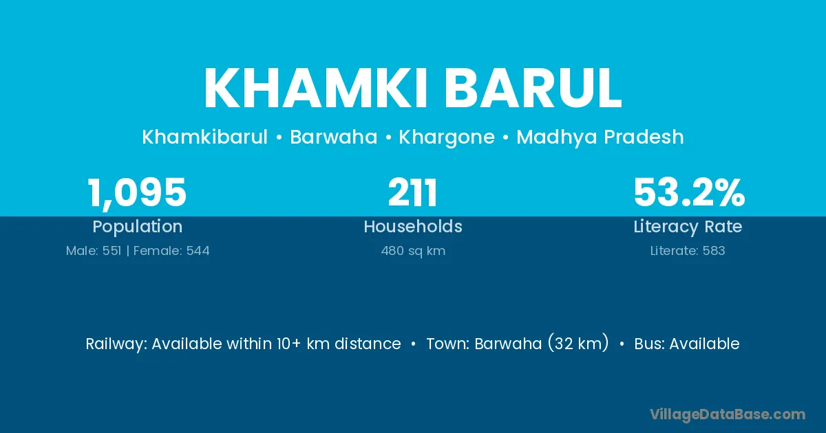 Barwaha (32 km) is the nearest town to Khamki Barul village for major economic activities and is located approximately 32 km away.
