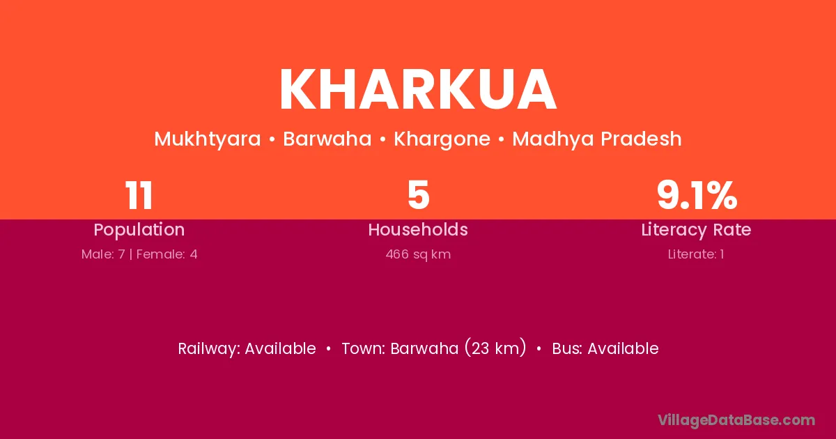 Barwaha (23 km) is the nearest town to Kharkua village for major economic activities and is located approximately 23 km away.