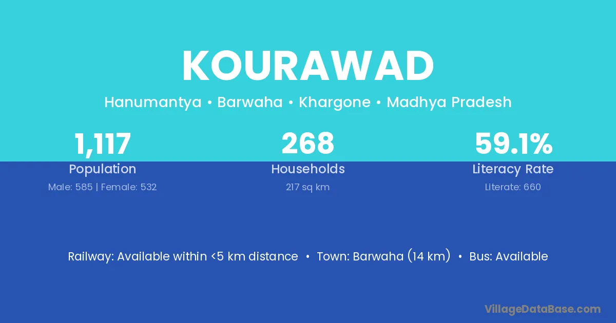 Barwaha (14 km) is the nearest town to Kourawad village for major economic activities and is located approximately 14 km away.
