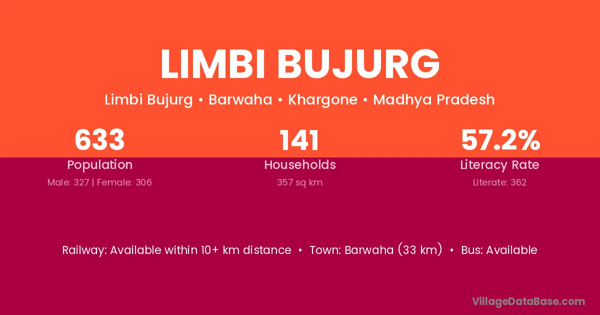 Barwaha (33 km) is the nearest town to Limbi Bujurg village for major economic activities and is located approximately 33 km away.