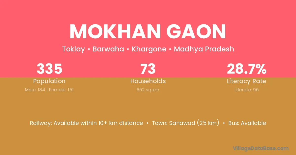 Sanawad (25 km) is the nearest town to Mokhan Gaon village for major economic activities and is located approximately 25 km away.
