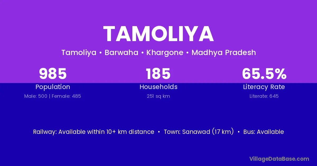 Sanawad (17 km) is the nearest town to Tamoliya village for major economic activities and is located approximately 17 km away.
