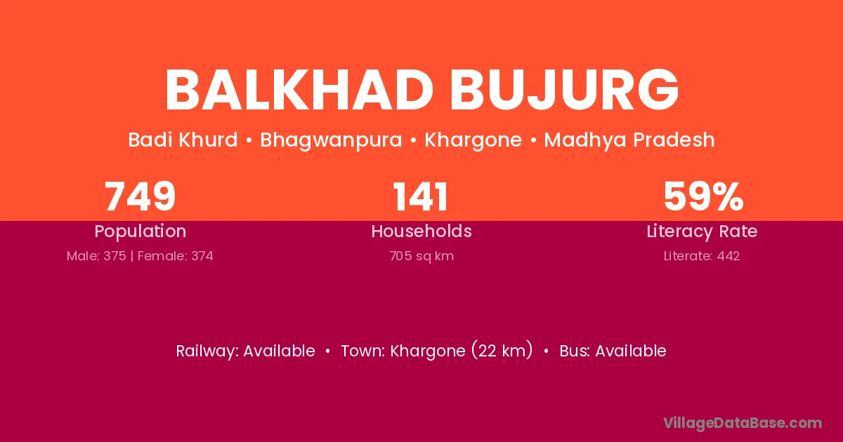Khargone (22 km) is the nearest town to Balkhad Bujurg village for major economic activities and is located approximately 22 km away.