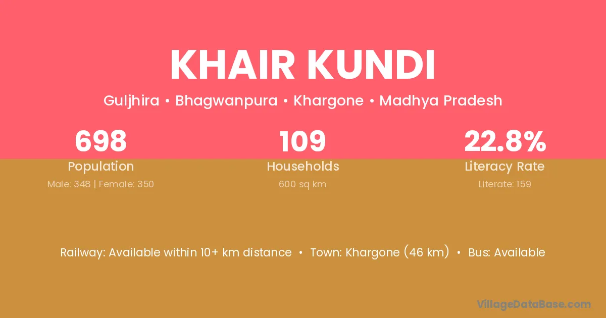 Khargone (46 km) is the nearest town to Khair Kundi village for major economic activities and is located approximately 46 km away.
