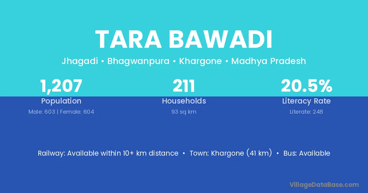 Khargone (41 km) is the nearest town to Tara Bawadi village for major economic activities and is located approximately 41 km away.