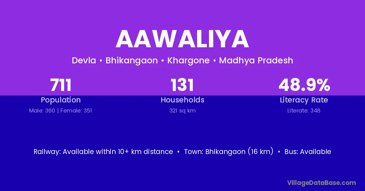 Bhikangaon (16 km) is the nearest town to Aawaliya village for major economic activities and is located approximately 16 km away.