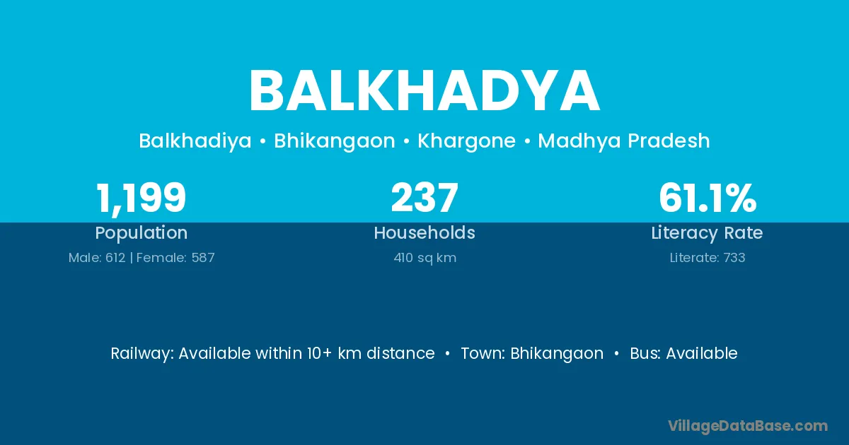 Balkhadya village has a total population of 1,199 people, of which 612 are males and 587 are females.