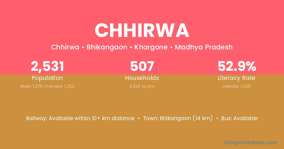 Chhirwa village has a total population of 2,531 people, of which 1,279 are males and 1,252 are females.