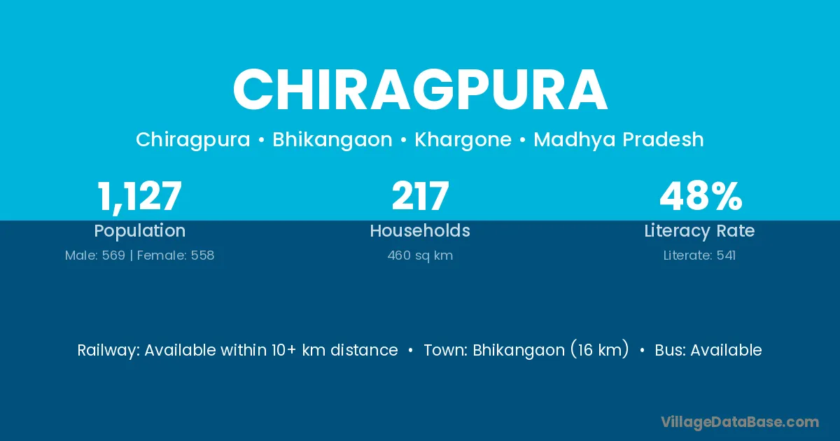 Bhikangaon (16 km) is the nearest town to Chiragpura village for major economic activities and is located approximately 16 km away.