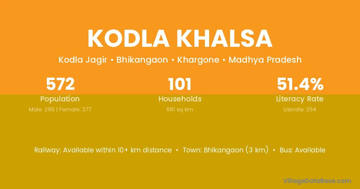 Bhikangaon (3 km) is the nearest town to Kodla Khalsa village for major economic activities and is located approximately 3 km away.