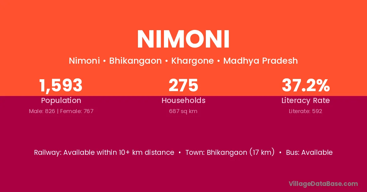 Bhikangaon (17 km) is the nearest town to Nimoni village for major economic activities and is located approximately 17 km away.