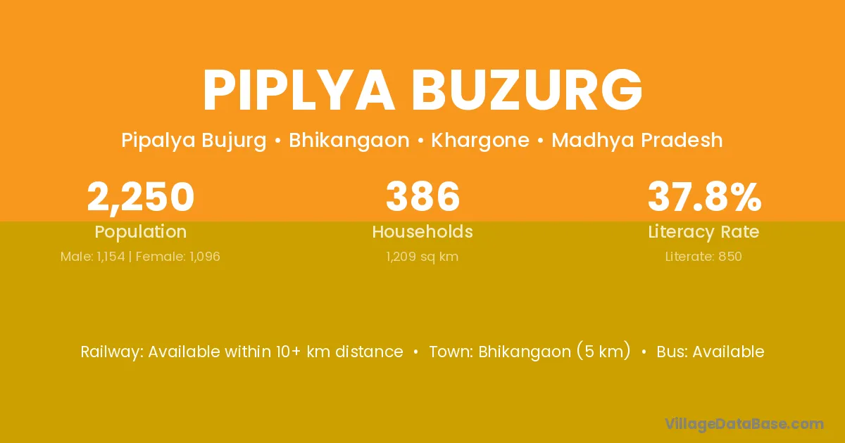 Bhikangaon (5 km) is the nearest town to Piplya Buzurg village for major economic activities and is located approximately 5 km away.