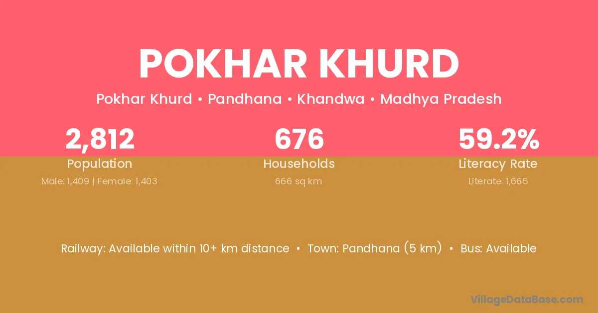 Khargone (60 km) is the nearest town to Pokhar Khurd village for major economic activities and is located approximately 60 km away.
