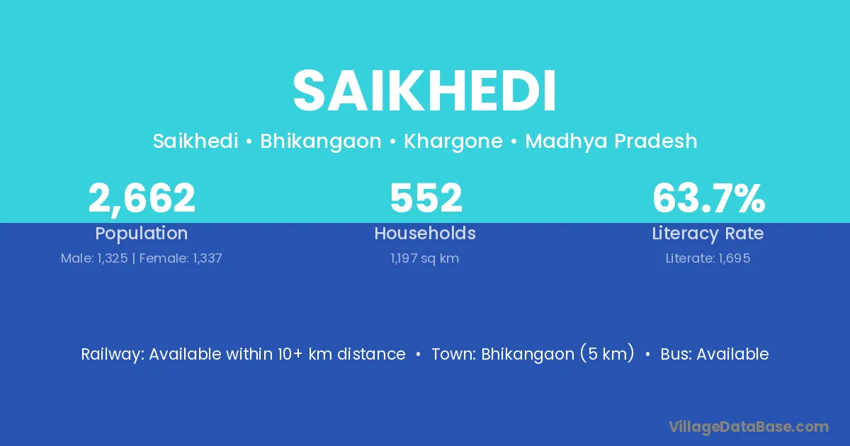 Saikhedi village has a total population of 2,662 people, of which 1,325 are males and 1,337 are females.