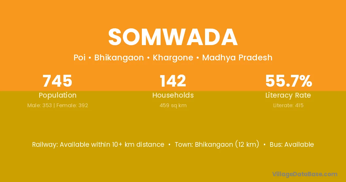 Bhikangaon (12 km) is the nearest town to Somwada village for major economic activities and is located approximately 12 km away.