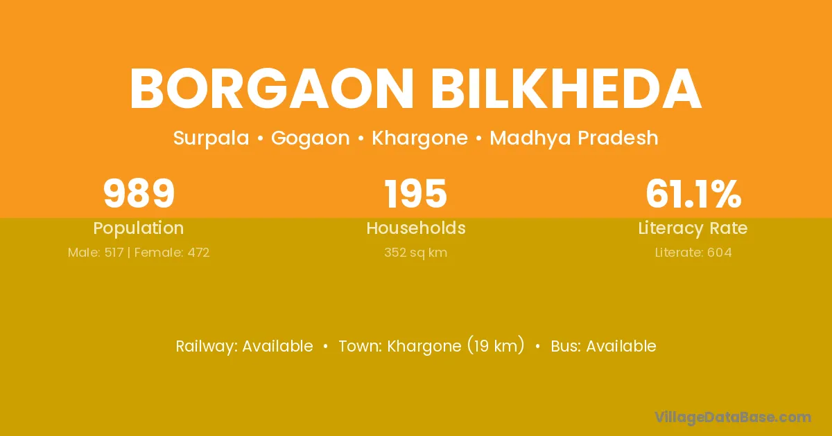 Borgaon Bilkheda village has a total population of 989 people, of which 517 are males and 472 are females.