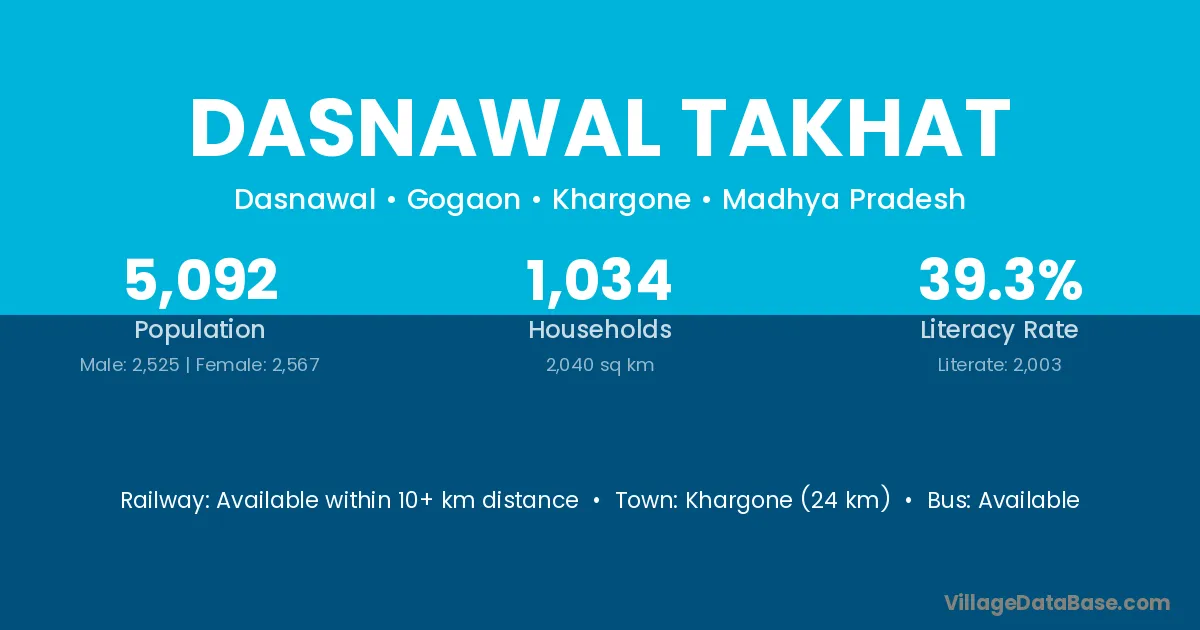 Khargone (24 km) is the nearest town to Dasnawal Takhat village for major economic activities and is located approximately 24 km away.